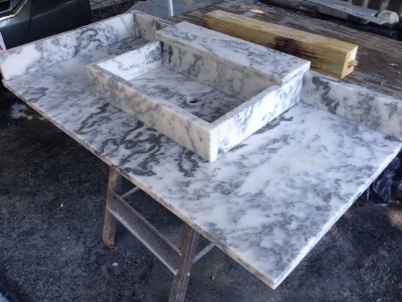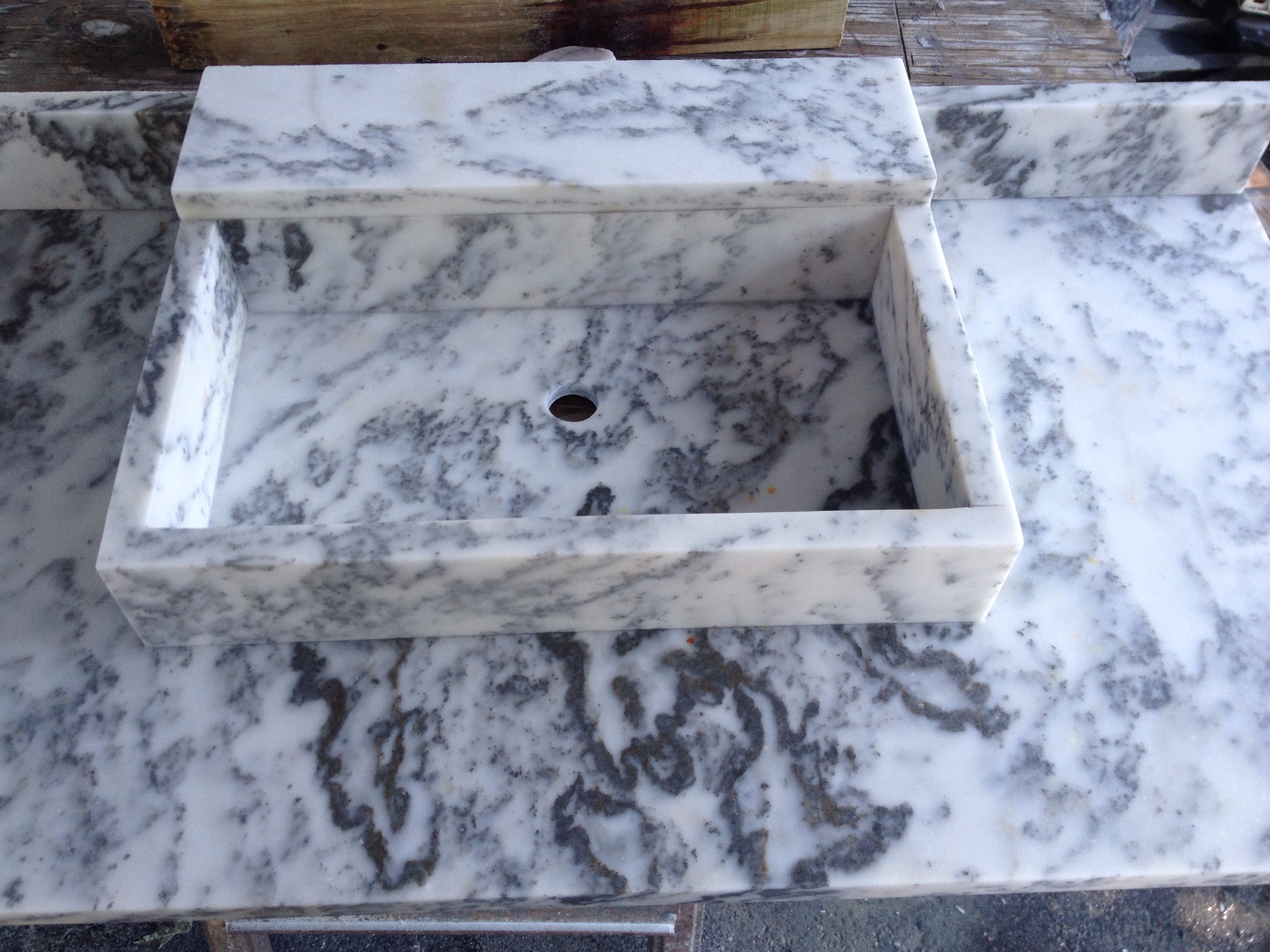 Marble vanity piece. Posted on September 30, 2015 by Artistic Soapstone, Incorporated Reply I got a piece of imperial Danby white marble from an island in Boston. The warehouse was 270 years old. Here you see the before picture of the slab and the after of the one piece vanity.