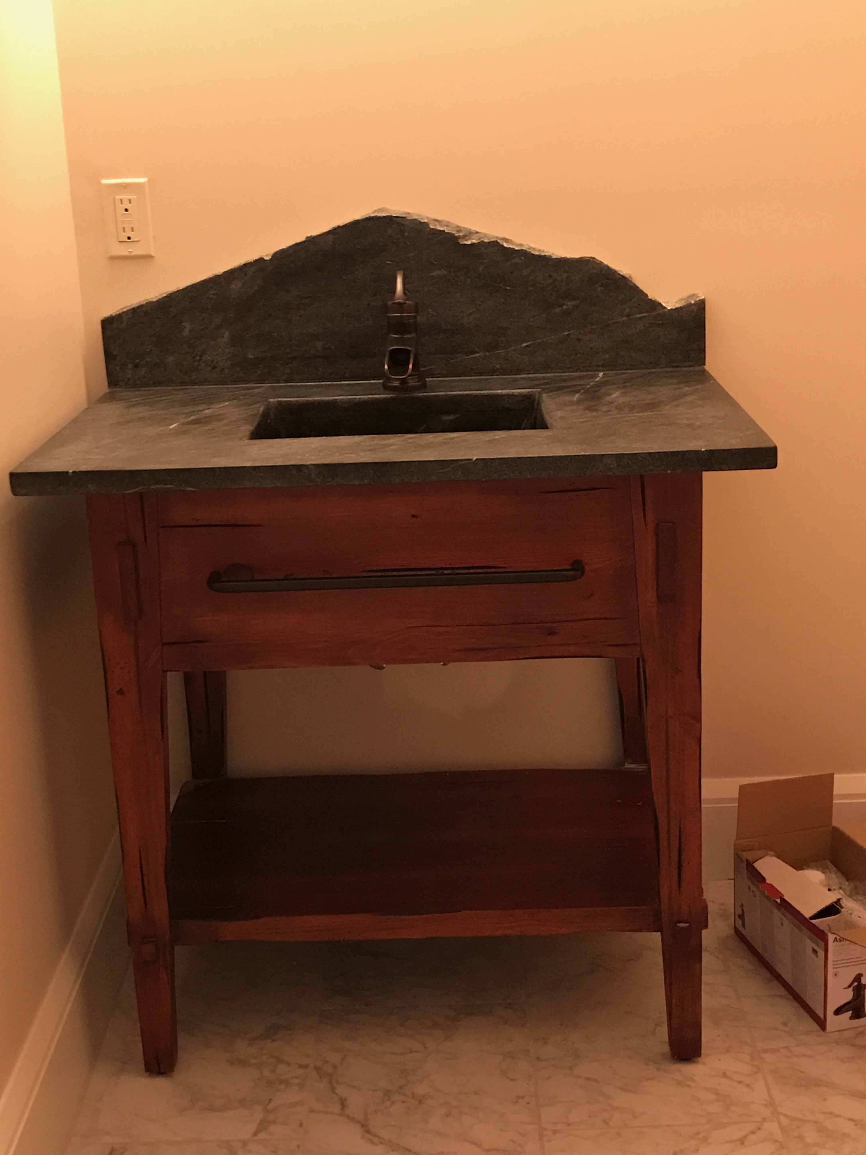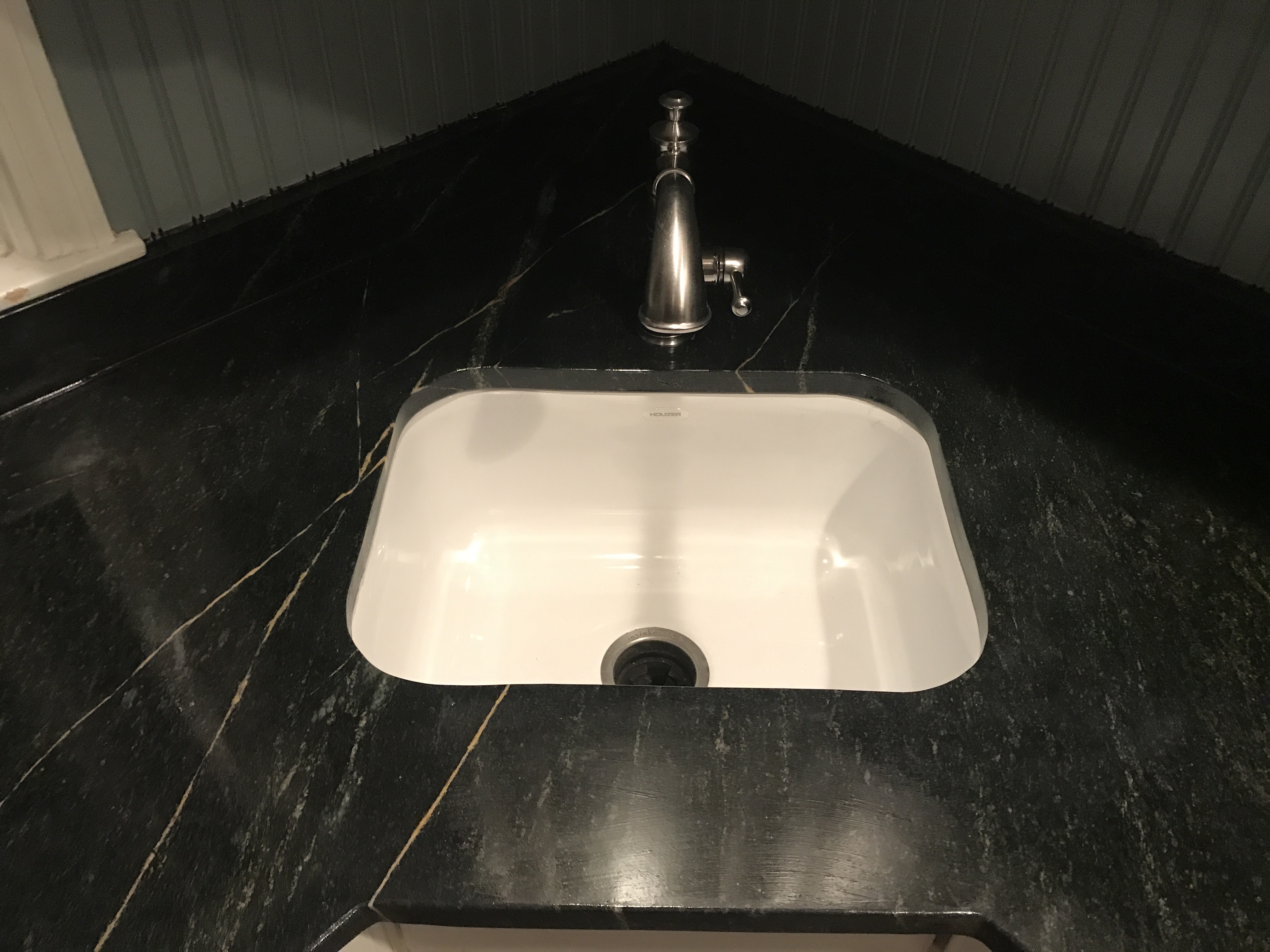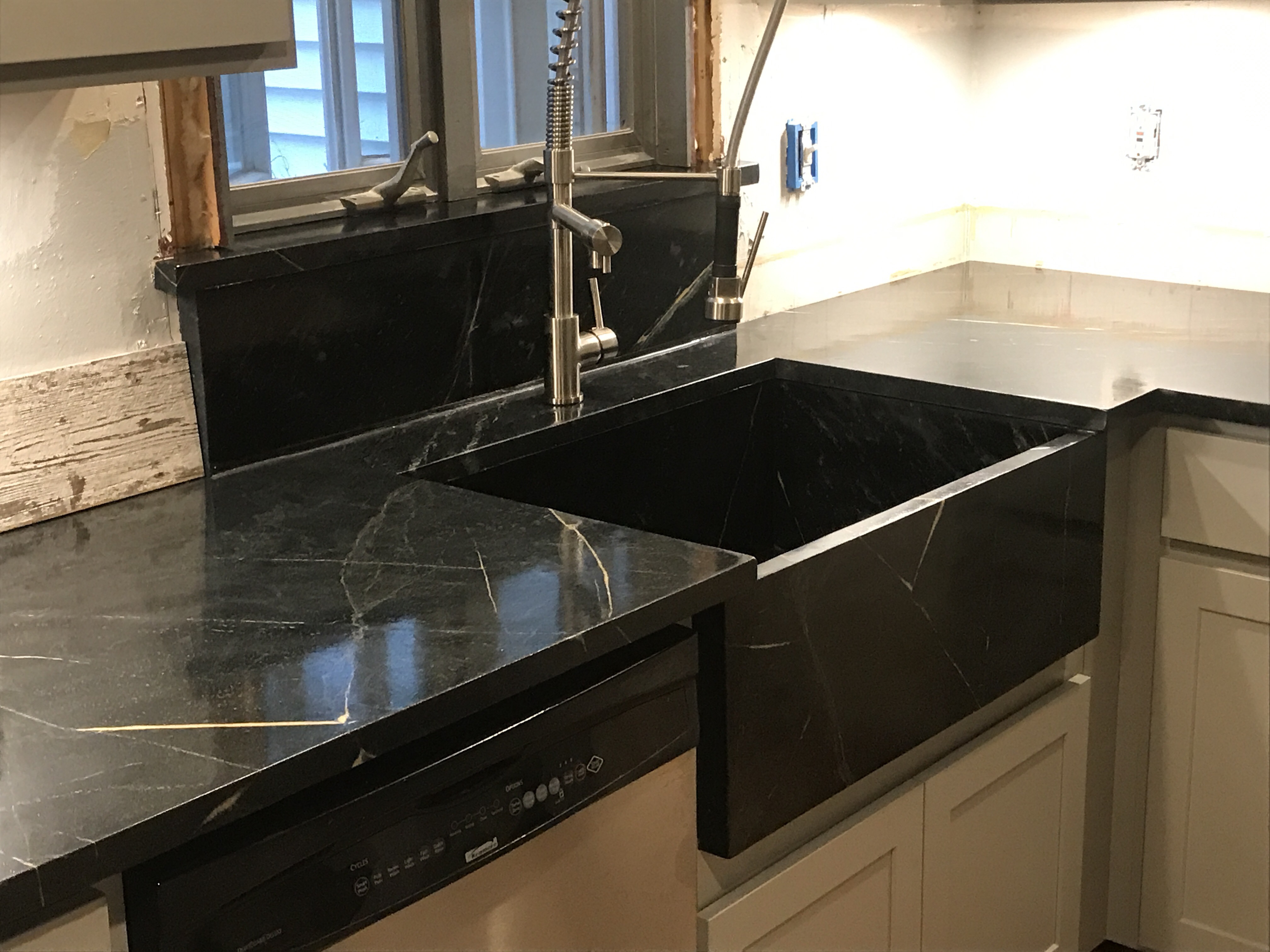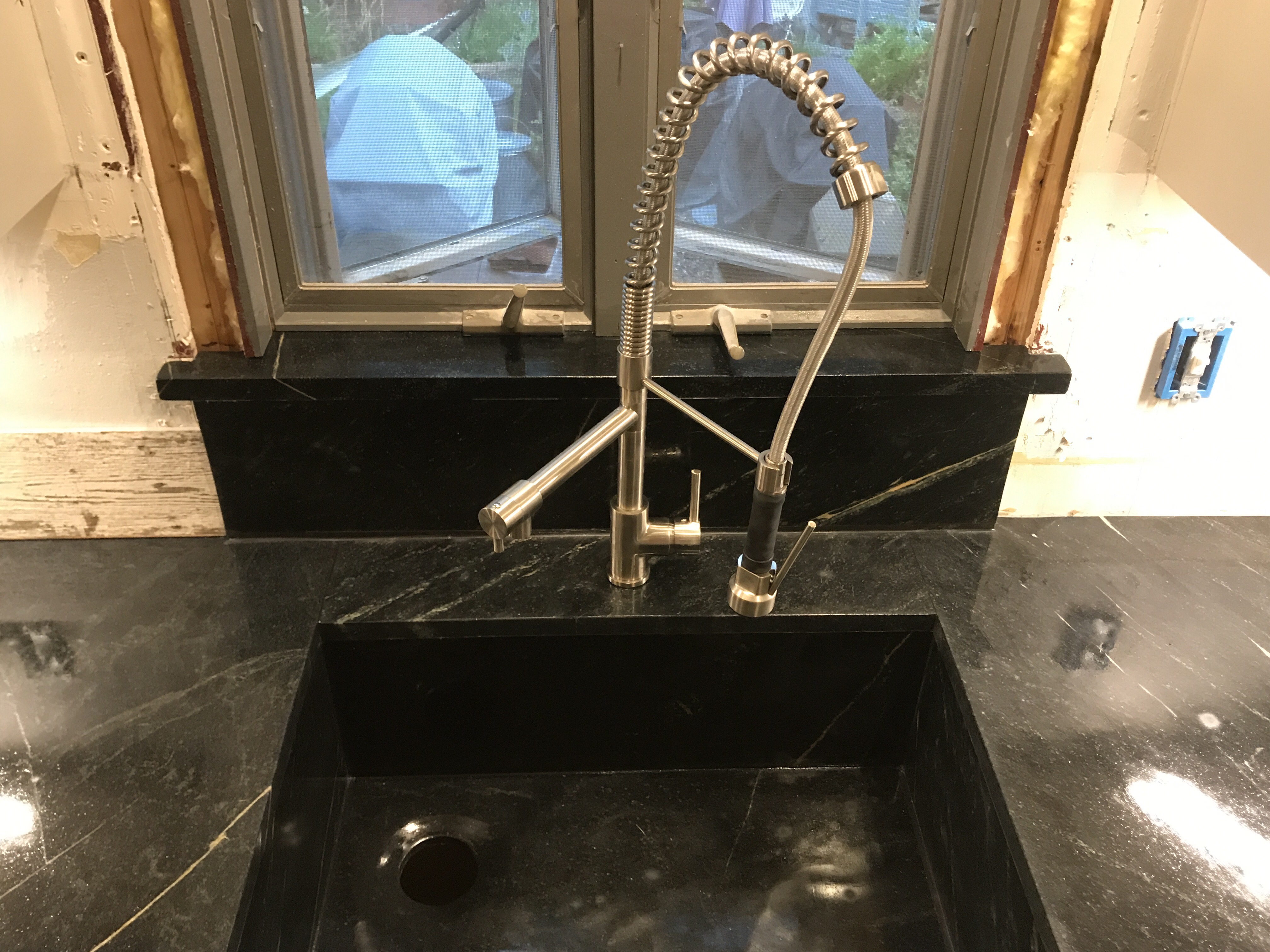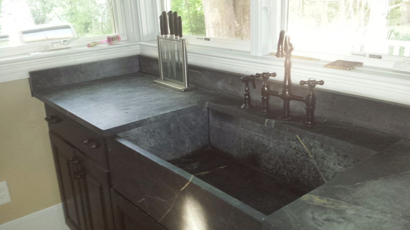 36×22 integrated Minas sink with broken look backsplash Posted on August 5, 2017 by Artistic Soapstone, Incorporated Reply Just got this sink done. Designer wanted a broken mountainous looking backsplash. It was interesting and challenging to learn to intentionally break stone.