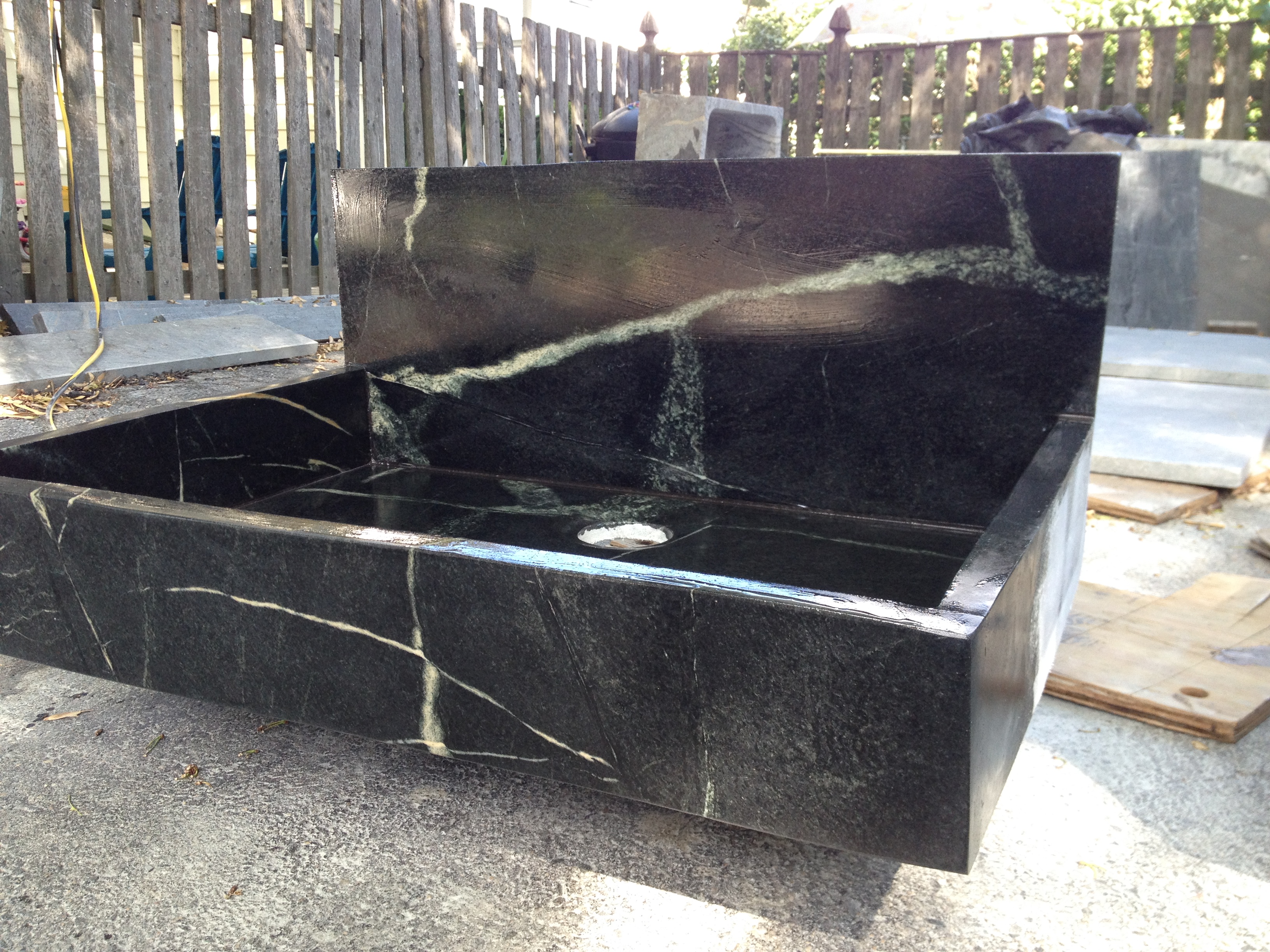 This is a big 23 3/4 X 34 sink with 9 inch back splash that I finished last week for a designer out of Maine. It is 4 inches deep with a slightly slanted front. It is made out of a nice slab of Minas soapstone.